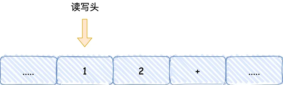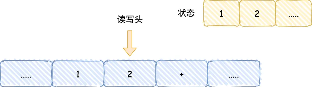 - 首先,用读写头把 「1、2、+」这 3 个字符分别写入到纸带上的 3 个格子,然后读写头先停在 1 字符对应的格子上;