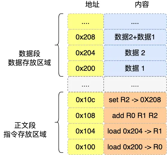 编译器会把 a = 1 + 2 翻译成 4 条指令,存放到正文段中。如图,这 4 条指令被存放到了 0x100 ~ 0x10c 的区域中: