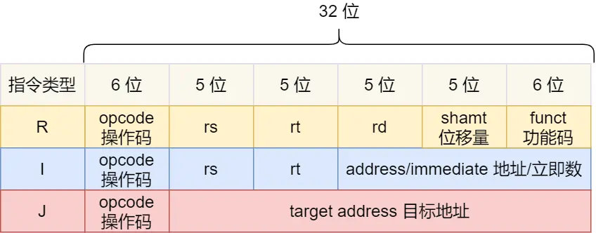 MIPS 的指令是一个 32 位的整数,高 6 位代表着操作码,表示这条指令是一条什么样的指令,剩下的 26 位不同指令类型所表示的内容也就不相同,主要有三种类型R、I 和 J。