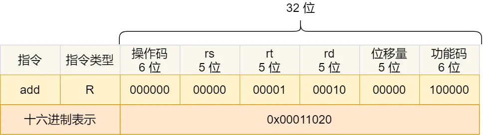 把上面这些数字拼在一起就是一条 32 位的 MIPS 加法指令了,那么用 16 进制表示的机器码则是 0x00011020。