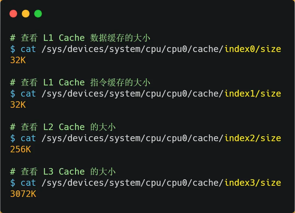 在 Linux 系统中,我们可以使用下图的方式来查看各级 CPU Cache 的大小,比如我这手上这台服务器,离 CPU 核心最近的 L1 Cache 是 32KB,其次是 L2 Cache 是 256KB,最大的 L3 Cache 则是 3MB。
