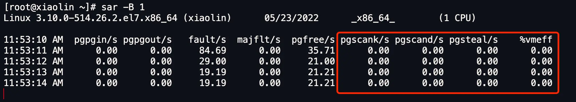 我们可以使用 sar -B 1 命令来观察: