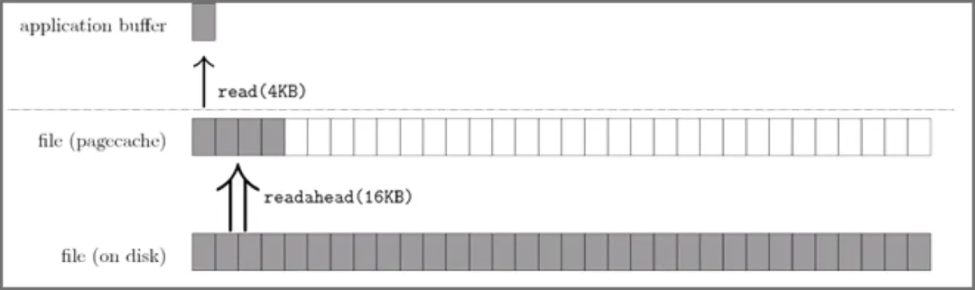 上图中,应用程序利用 read 系统调动读取 4KB 数据,实际上内核使用 readahead 机制完成了 16KB 数据的读取。
