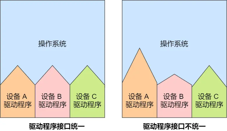不同的设备控制器虽然功能不同,但是设备驱动程序会提供统一的接口给操作系统 ,这样不同的设备驱动程序,就可以以相同的方式接入操作系统。如下图: