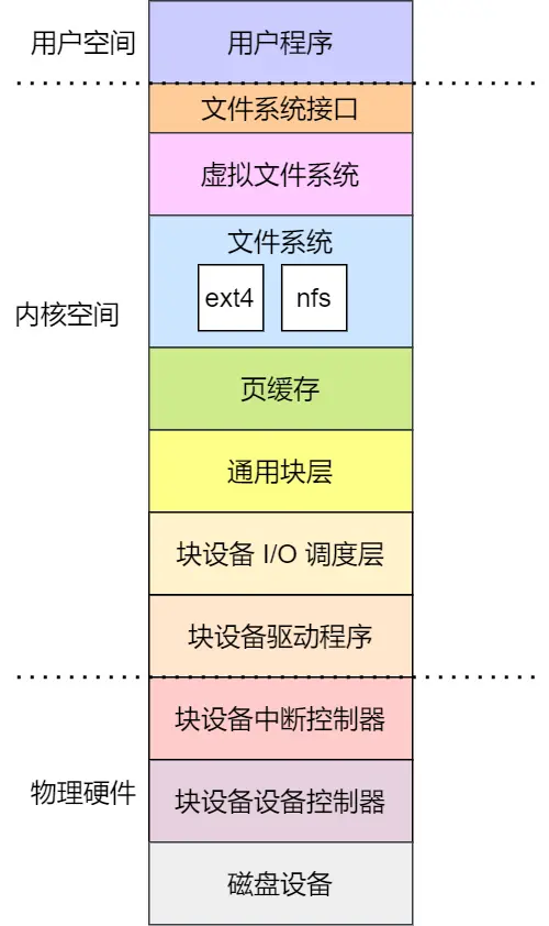 - 文件系统层,包括虚拟文件系统和其他文件系统的具体实现,它向上为应用程序统一提供了标准的文件访问接口,向下会通过通用块层来存储和管理磁盘数据。