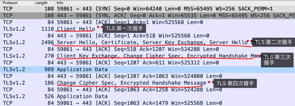 我用 Wireshark 工具抓了用 ECDHE 密钥协商算法的 TSL 握手过程,可以看到是四次握手: