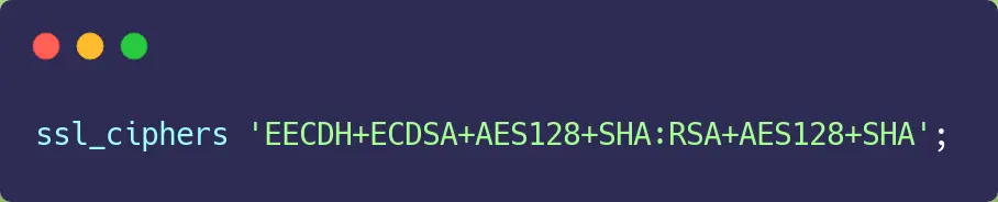 比如在 Nginx 上,可以使用 ssl_ciphers 指令配置想使用的非对称加密算法和对称加密算法,也就是密钥套件,而且把性能最快最安全的算法放在最前面:
