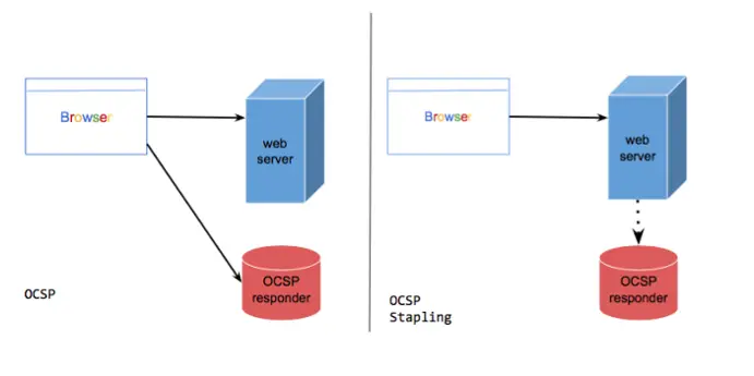 于是为了解决这一个网络开销,就出现了 OCSP Stapling,其原理是:服务器向 CA 周期性地查询证书状态,获得一个带有时间戳和签名的响应结果并缓存它。