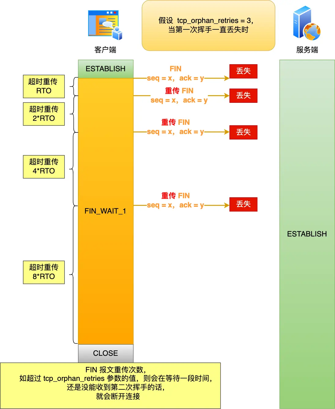 客户端出现故障指的是客户端的主机发生了宕机,或者断电的场景。发生这种情况的时候,如果服务端一直不会发送数据给客户端,那么服务端是永远无法感知到客户端宕机这个事件的,也就是服务端的 TCP 连接将一直处于 ESTABLISH 状态,占用着系统资源。