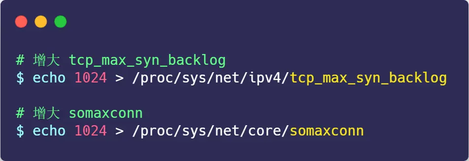 增大 tcp_max_syn_backlog 和 somaxconn 的方法是修改 Linux 内核参数: