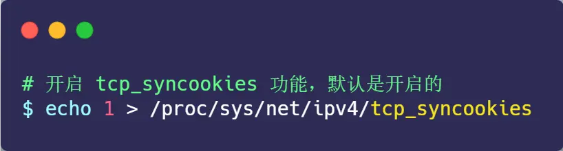 那么在应对 SYN 攻击时,只需要设置为 1 即可: