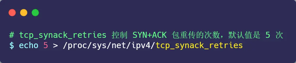 当网络繁忙、不稳定时,报文丢失就会变严重,此时应该调大重发次数。反之则可以调小重发次数。修改重发次数的方法是,调整 tcp_synack_retries 参数 :