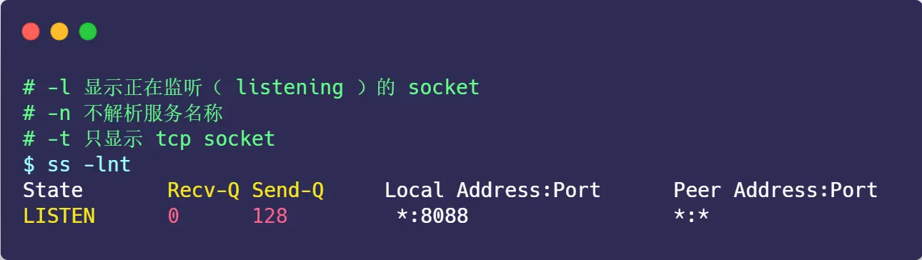 accept()的 TCP 连接; - Send-Q:accept 队列最大长度,上面的输出结果说明监听 8088 端口的 TCP 服务,accept 队列的最大长度为 128;
