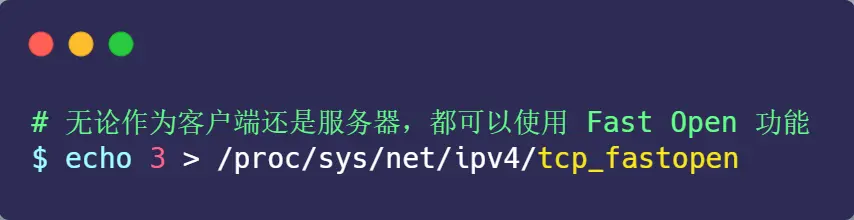 在 Linux 系统中,可以通过设置 tcp_fastopn 内核参数,来打开 Fast Open 功能 :