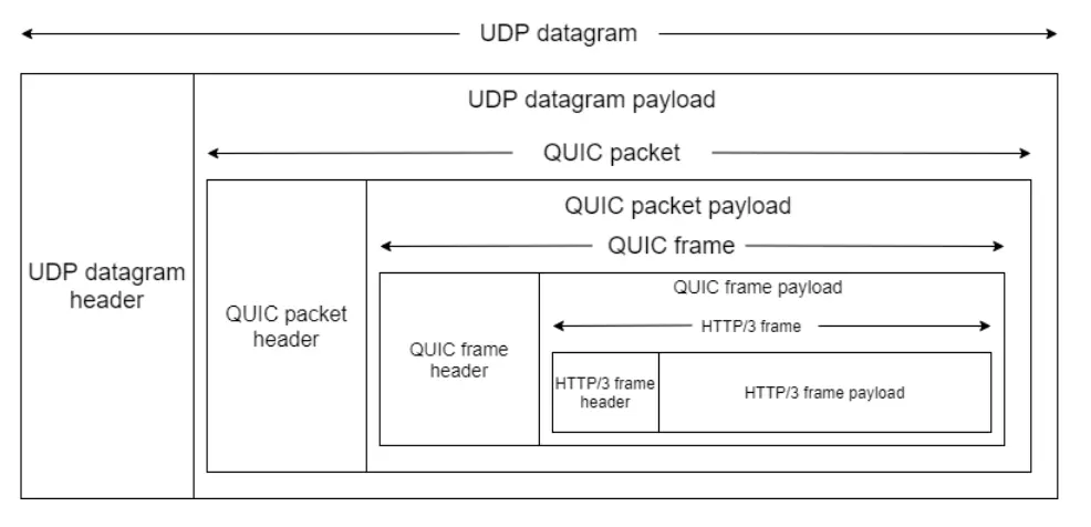 拿 HTTP/3 举例子,在 UDP 报文头部与 HTTP 消息之间,共有 3 层头部: