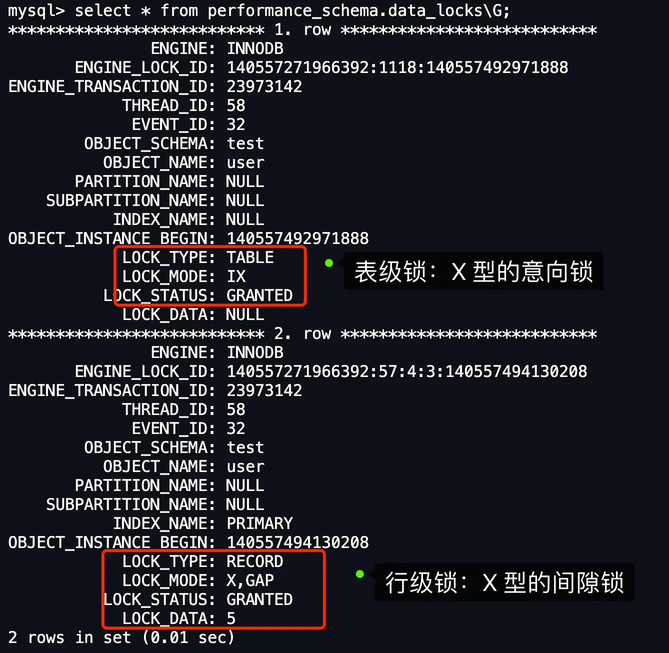 这里我们重点关注行级锁,图中 LOCK_TYPE 中的 RECORD 表示行级锁,而不是记录锁的意思。