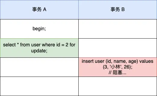 mysql> select * from user where age >= 22 for update;