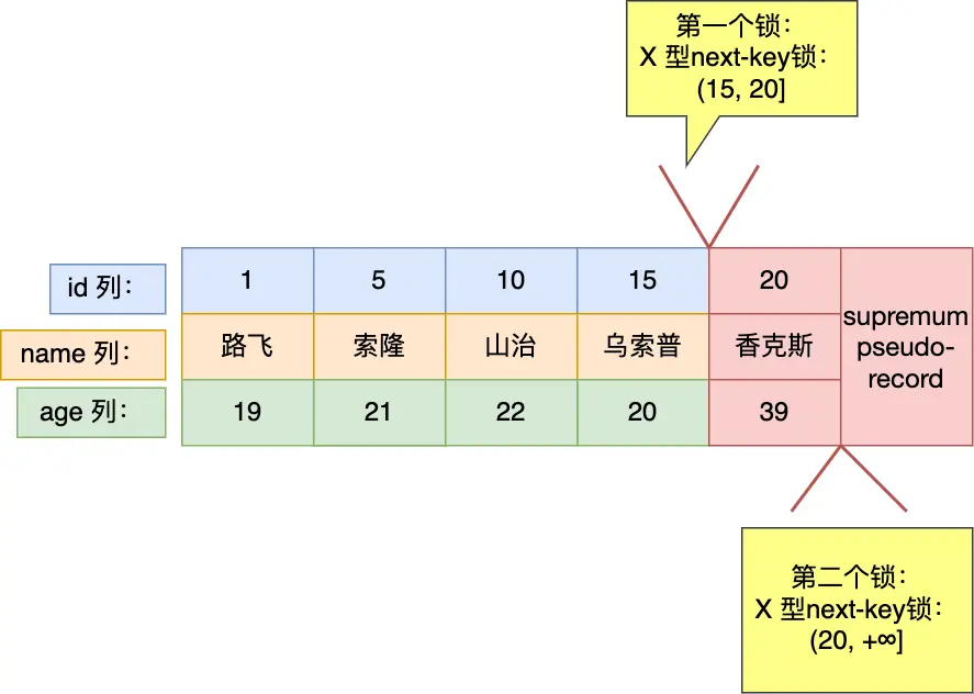- 虽然我们看见表中最后一条二级索引记录是 age = 39 的记录,但是实际在 Innodb 存储引擎中,会用一个特殊的记录来标识最后一条记录,该特殊的记录的名字叫 supremum pseudo-record ,所以扫描第二行的时候,也就扫描到了这个特殊记录的时候,会对该二级索引记录加的是范围为 (39, +∞] 的 next-key 锁。