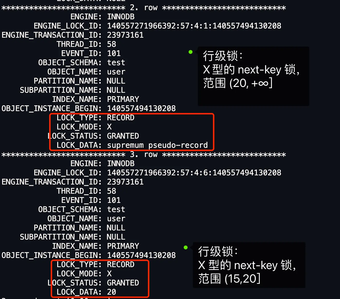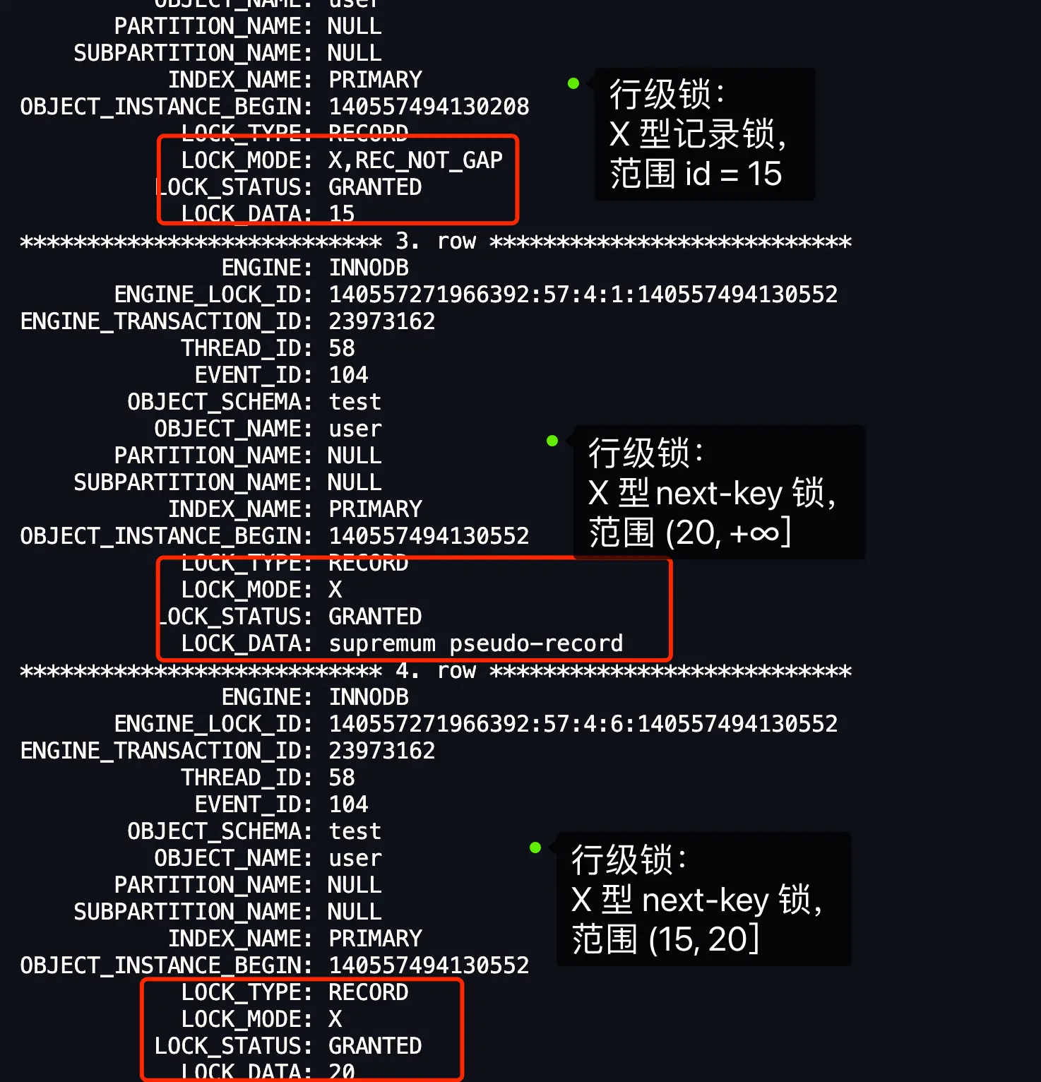 通过 LOCK_MODE 可以确认是 next-key 锁,还是间隙锁,还是记录锁: