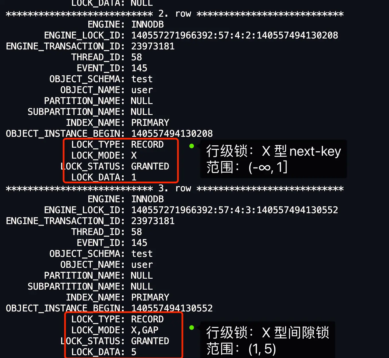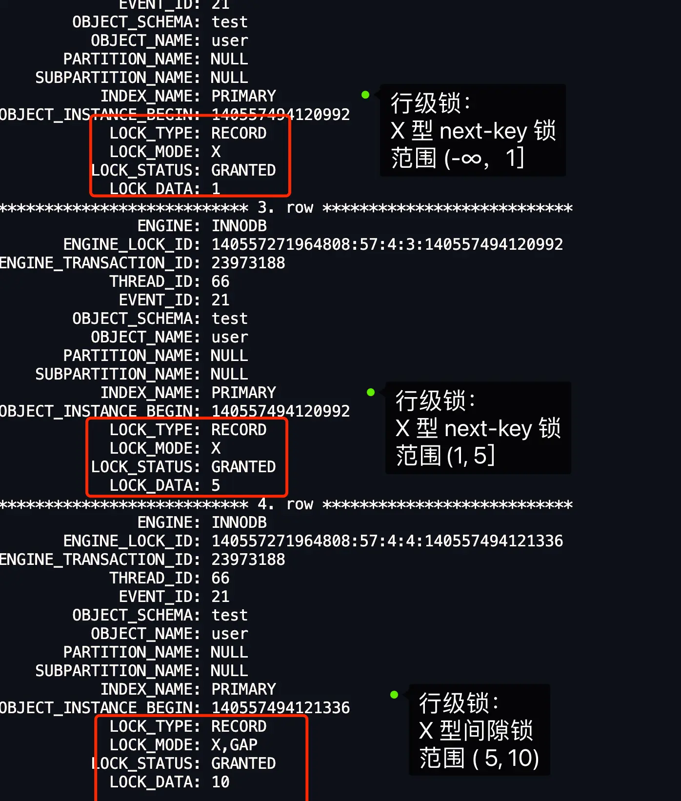 X, REC_NOT_GAP,说明是记录锁; - 如果 LOCK_MODE 为