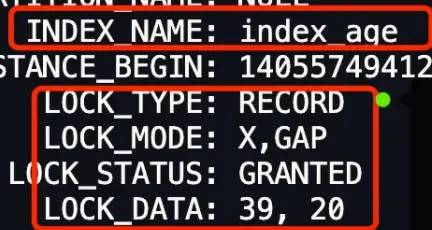- LOCK_DATA 第一个数值,也就是 39, 它代表的是 age 值。从前面我们也知道了,LOCK_DATA 第一个数值是 next-key 锁和间隙锁锁住的范围的右边界值 。