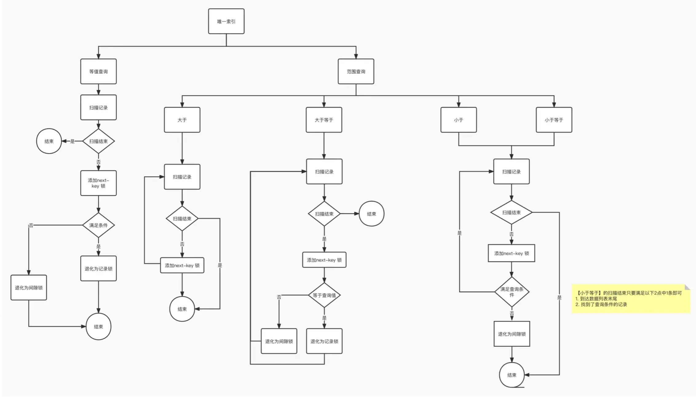 唯一索引(主键索引)加锁的流程图如下。( 注意这个流程图是针对「主键索引」的,如果是二级索引的唯一索引,除了流程图中对二级索引的加锁规则之外,还会对查询到的记录的主键索引项加「记录锁」,流程图没有提示这一个点,所以在这里用文字补充说明下 )