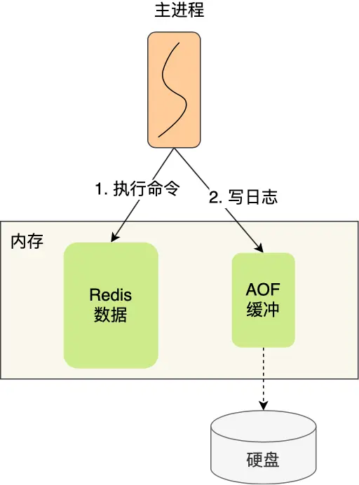 第一个风险,执行写操作命令和记录日志是两个过程,那当 Redis 在还没来得及将命令写入到硬盘时,服务器发生宕机了,这个数据就会有丢失的风险 。