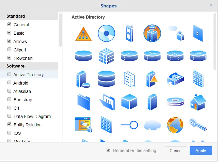 其中,最左边的「图形选择区域」可以选择的图案有很多种,常见的流程图、时序图、表格图都有,甚至还可以在最左下角的「更多图形」找到其他种类的图形,比如网络设备图标等。