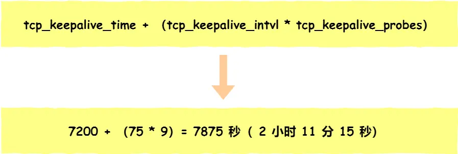 在 Linux 内核可以有对应的参数可以设置保活时间、保活探测的次数、保活探测的时间间隔,以下都为默认值: