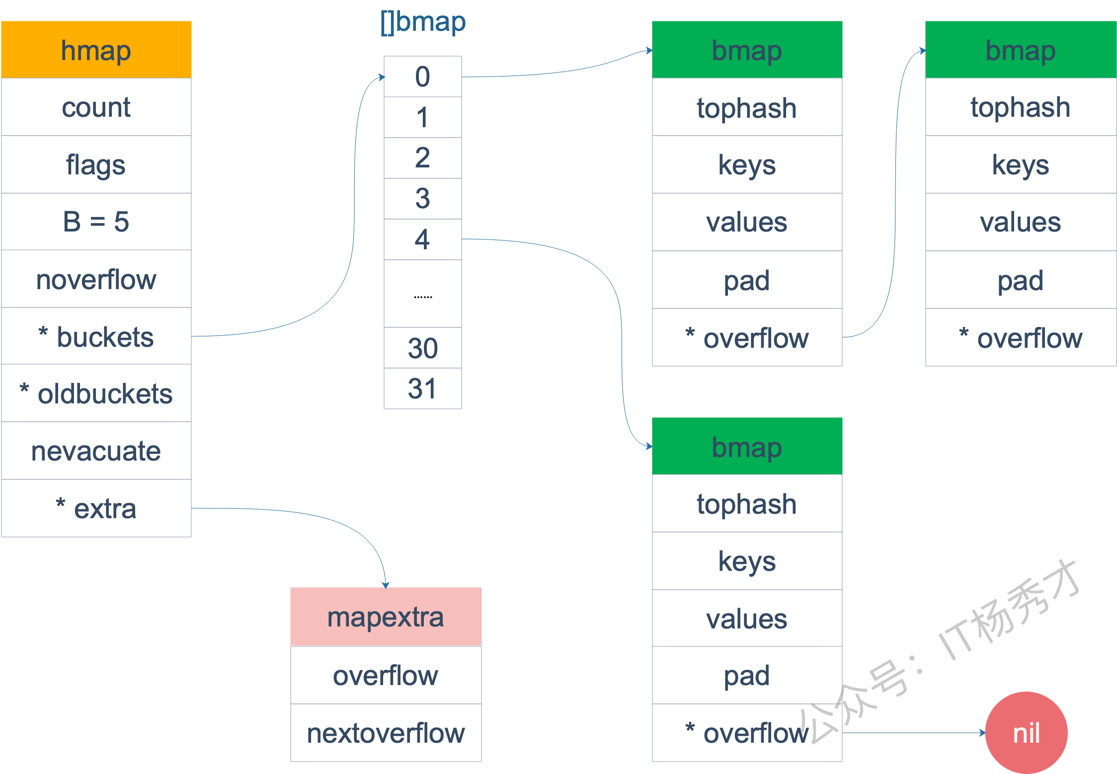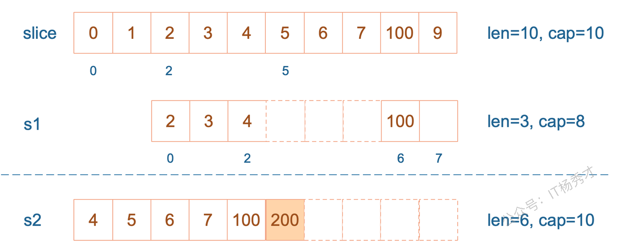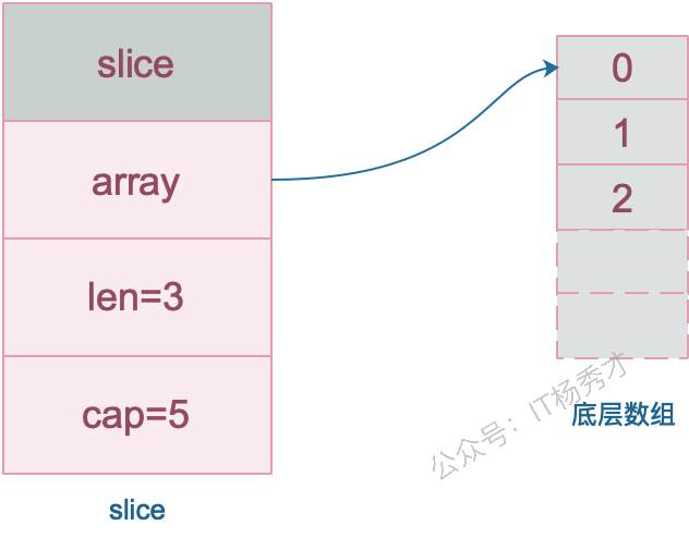 slice 的底层数据其实也是数组,slice 是对数组的封装,它描述一个数组的片段。slice 实际上是一个结构体,包含三个字段:长度、容量、底层数组。